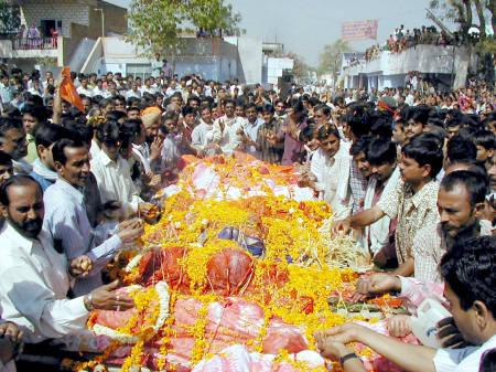congregating at the temple and reverently touching Baldevdasji's